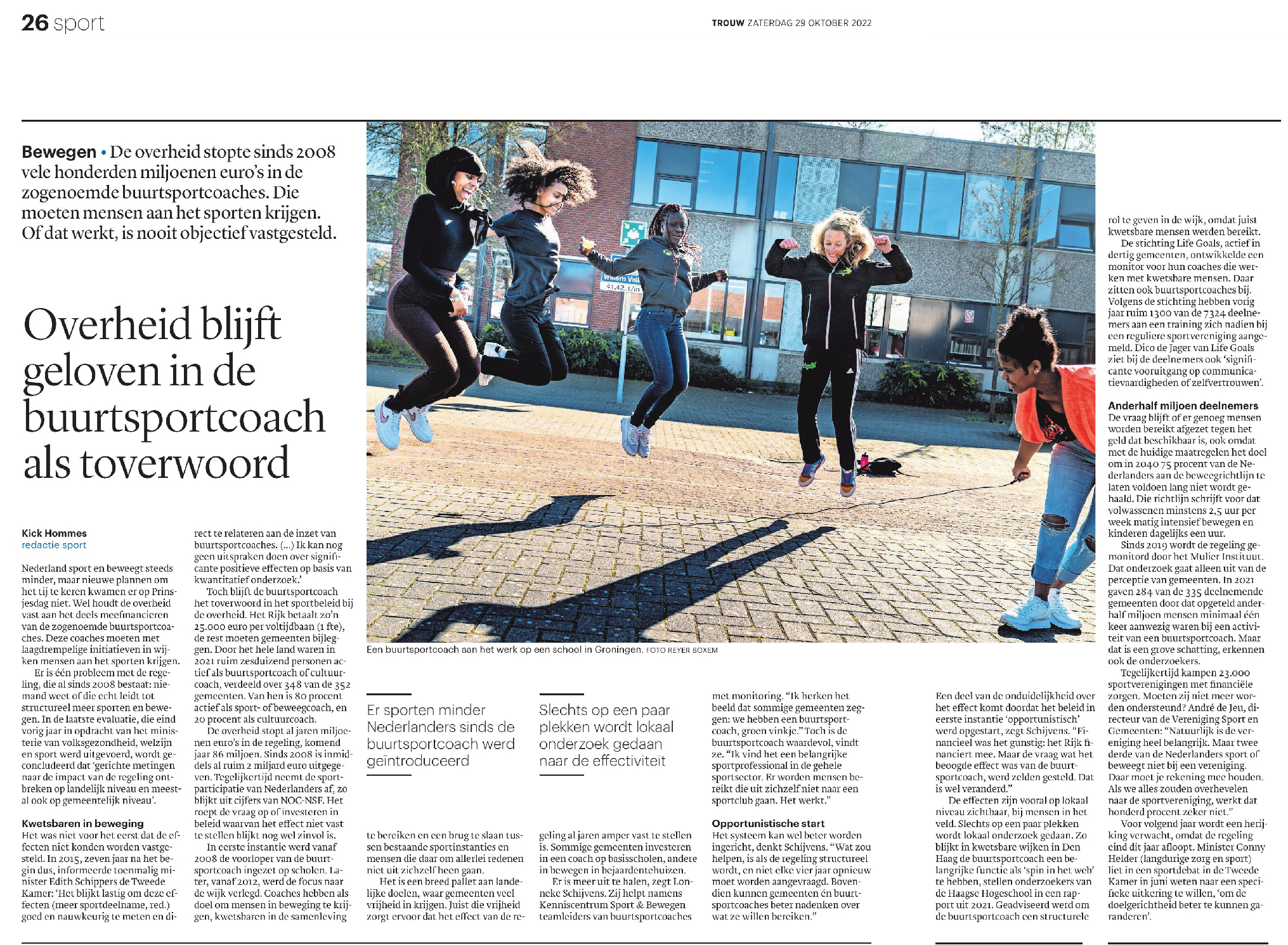 De overheid stopt sinds 2008 vele honderden miljoenen euro’s in de zogenoemde buurtsportcoaches. Die moeten mensen aan het sporten krijgen. Of dat werkt is nooit objectief vastgesteld – Kick Hommes in Trouw – dd. 22 oktober 2022